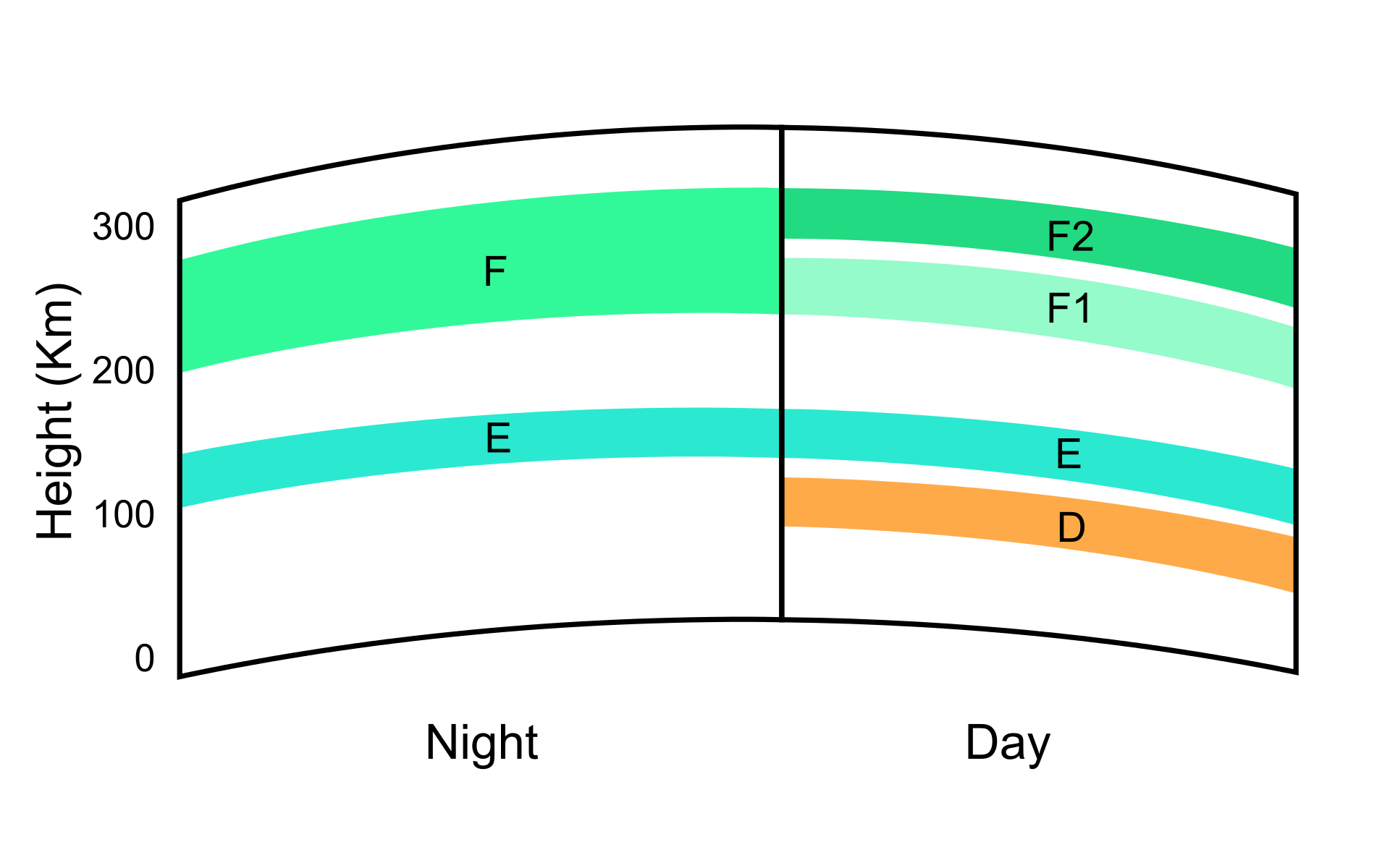 Medium frequency (MF) and lower high frequency (HF) radio waves are significantly attenuated within the D layer, as the passing radio waves cause electrons to move, which then collide with the neutral molecules, giving up their energy. Lower frequencies experience greater absorption because they move the electrons farther, leading to a greater chance of collisions. This is the main reason for the absorption of HF radio waves, particularly at 10 MHz and below, with progressively less absorption at higher frequencies. This effect peaks around noon and is reduced at night due to a decrease in the D layer’s thickness; only a small part remains due to cosmic rays. A common example of the D layer in action is the disappearance of distant AM broadcast band stations in the daytime.